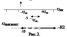 6. Линейный режим будет в том случае, когда выходное напряжение больше отрицательного максимального напряжения, но меньше положительного максимального напряжения. В реальных ОУ предельное значение выходного напряжения êUВЫХ.МАКС ê= ( 0,9 ¸ 0,95 )Е. При анализе устройств на ОУ принимают UВЫХ.МАКС = ± Е.
