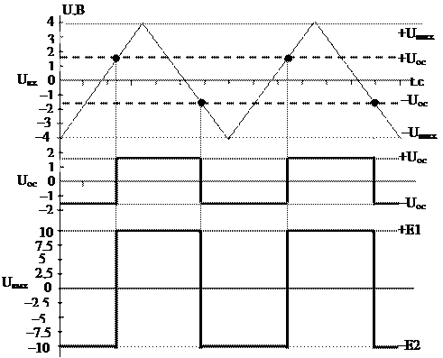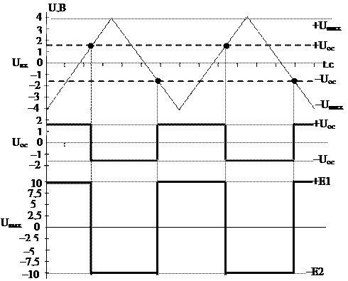 По оси времени зарисовать входной сигнал симметричной треугольной формы. В рассматриваемом отрезке времени два периода. Пунктиром отметить уровни напряжения обратной связи ±Uос. Указать точки срабатывания компаратора, которые устанавливаются в точках пересечения уровней напряжений обратной связи и входного напряжения по приближению. По свойствам операционного усилителя определить уровни устойчивых состояний выходного сигнала. Зарисовать выходной сигнал.
