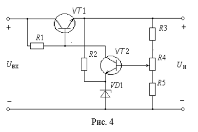 Принципиальная схема одного из вариантов компенсационного стабилизатора, реализующего функциональную схему, изображенную на рис. 2, приведена на рис. 4. В роли регулирующего элемента выступает транзистор VT1; источником эталонного напряжения служит параметрический стабилизатор на стабилитроне VD1 и резисторе R2. Усилитель постоянного тока построен на транзисторе VT2, входная цепь которого выполняет функции схемы сравнения. Эмиттер транзистора подключен к источнику эталонного напряжения, а на его базу через резистивный делитель R3, R4, R5 (с коэффициентом передачи b) поступает сигнал, пропорциональный напряжению на нагрузке.