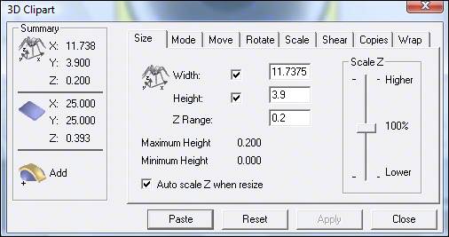 2. Для импорта рельефа цветка нажмите кнопку Загрузить рельеф(Load Relief) из пункта Редактирование рельефа(Relief Tools) в левом меню. Откройте файл 6.Motif.rlfиз директории Samples. Перейдите в окно 2D вида. В открывшемся диалоговом окне Трехмерный шаблон(3D clipart) перейдите на вкладку Масштабирование(Scale) (рис.6.6) и в поле Новый масштаб(New scale) задайте значение 25 %. Нажмите кнопку Применить(Apply).