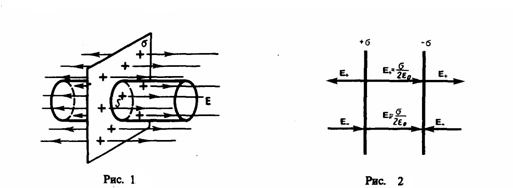 2.Поле двух бесконечных параллельных разноименно заряженных плоскостей(рис. 2). Пусть плоскости заряжены равномерно разными по знаку зарядами с поверхностными плотностями +σ и –σ. Поле таких плоскостей будем искать как суперпозицию полей, которые создаются каждой из плоскостей в отдельности. На рисунке верхние стрелки соответствуют полю от положительно заряженной плоскости, нижние — от отрицательно заряженной плоскости. Слева и справа от плоскостей поля вычитаются (поскольку линии напряженности направлены навстречу друг другу), значит здесь напряженность поля E=0. В области между плоскостями E = E+ + E- (E+ и E- находятся по формуле (1)), поэтому результирующая напряженность