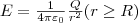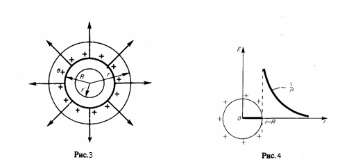 4.Поле равномерно заряженной сферической поверхности. Сферическая поверхность радиуса R с общим зарядом Q заряжена равномерно с поверхностной плотностью +σ. Т.к. заряд распределен равномерно по поверхности то поле, которое создается им, обладает сферической симметрией. Значит линии напряженности направлены радиально (рис. 3). Проведем мысленно сферу радиуса r, которая имеет общий центр с заряженной сферой. Если r>R,ro внутрь поверхности попадает весь заряд Q, который создает рассматриваемое поле, и, по теореме Гаусса, 4πr2E = Q/ε0 , откуда