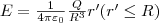 5.Поле объемно заряженного шара. Шар радиуса R с общим зарядом Q заряжен равномерно с объемной плотностью ρ (ρ = dQ/dV – заряд, который приходится на единицу объема). Учитывая соображения симметрии, аналогичные п.3, можно доказать, что для напряженности поля вне шара получится тот же результат, что и в случае (3). Внутри же шара напряженность поля будет иная. Сфера радиуса r'<R охватывает заряд Q'=(4/3)πr'3ρ . Поэтому, используя теорему Гаусса, 4πr'2E=Q'/ε0=(4/3)πr'3ρ/ε0 . Т.к. ρ=Q/(4/3πR3)) получаем