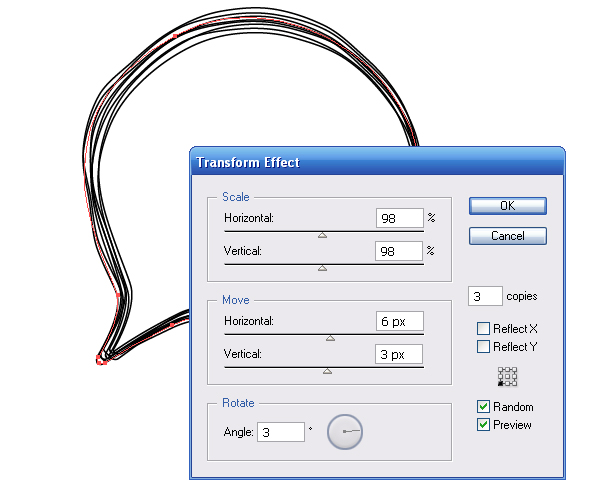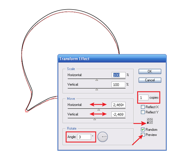 Выделяем объект и переходим Effect> Transform & Distort> Transform и устанавливаем параметры, указанные на рисунке ниже.