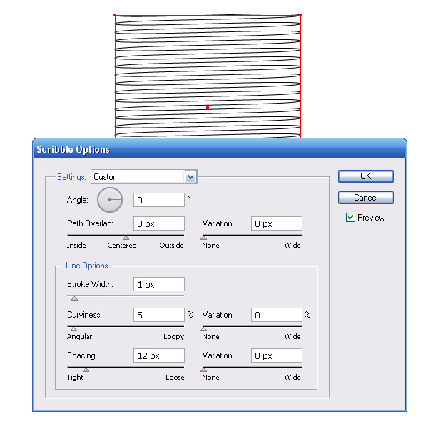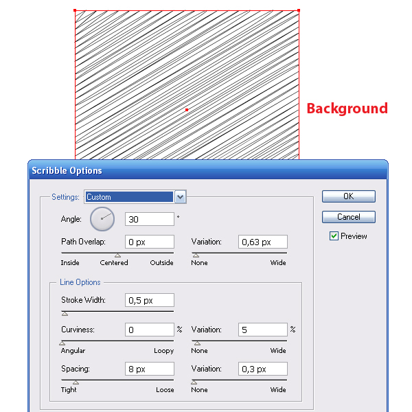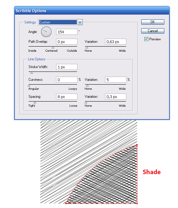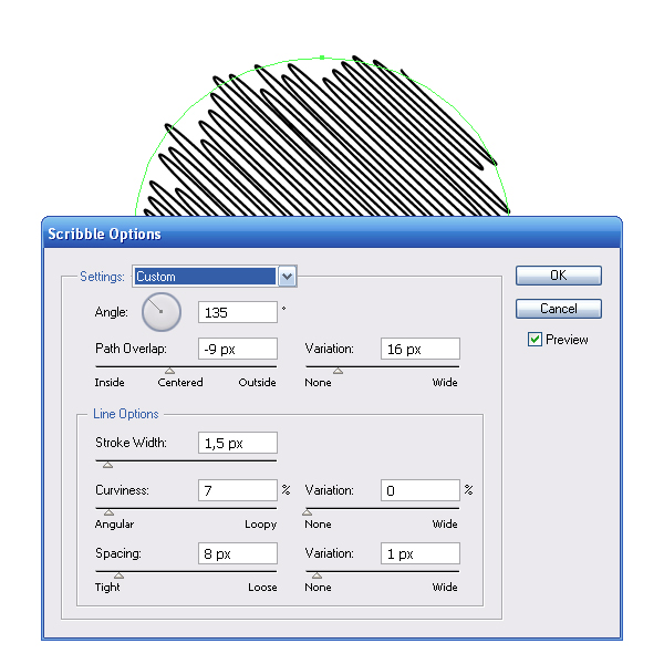 Переходим Effect> Stylize> Scribble и устанавливаем параметры эффекта. Чтобы понять, какой параметр за что отвечает, включите опцию preview и экспериментируйте, наблюдая за результатом, описывать это нахожу скучным.