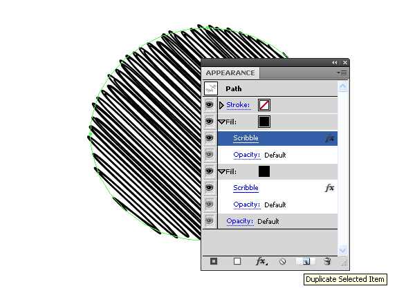 Для достижения более плотной затушевки, часто штрихи накладывают друг на друга в разных направлениях. Мы тоже можем создать такой эффект. Открываем палитру Appearance и дублируем заливку. Заливка копируется вместе с примененным к ней эффектом.