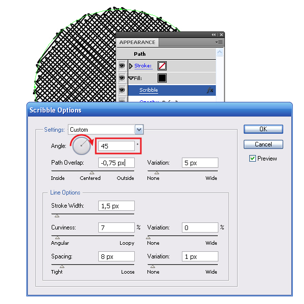 Теперь нажмем на новый эффект в палитре Appearance и изменим угол наклона штрихов.
