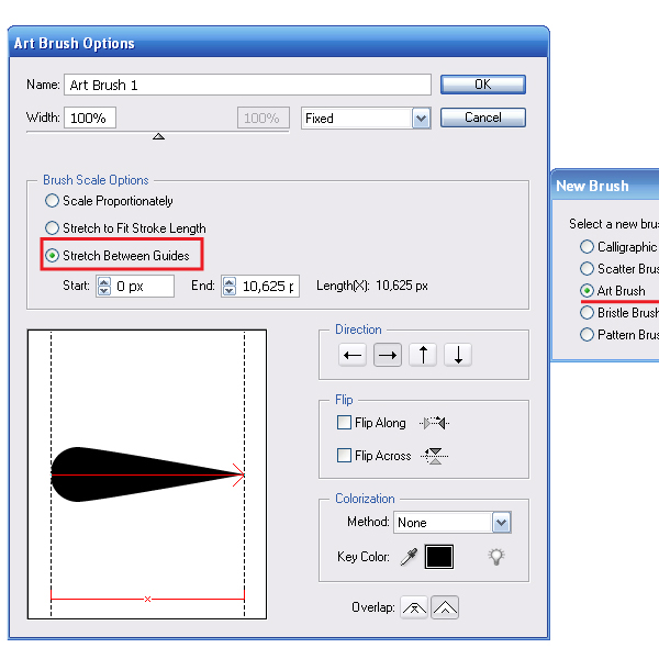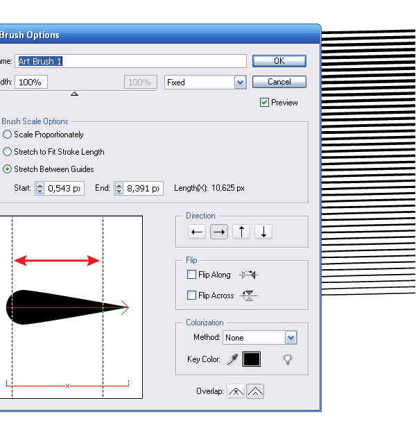 Пользователям Adobe Illustrator CS5 рекомендую выбрать опцию Stretch Between Guides, это даст вам больше возможностей в регулировке распределения толщины кисти вдоль контура. Теперь выделяем контур штриховки и применяем кисть.