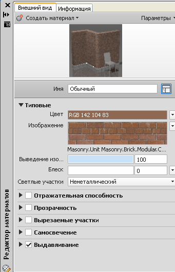 На внутренних вкладках этого окна расположено большое количество инструментов дополнительного преобразования: «Типовые», «Отражательная способность», «Прозрачность», «Вырезаемые участки», «Самосвечение», «Выдавливание». Однако состав вкладок не постоянен и зависит от выбранного базового материала и его категории.