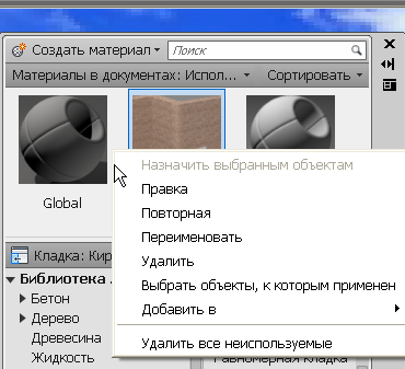 Для редактирования, переименования и удаления материалов можно использовать контекстное меню значка материала в обозревателе материалов.