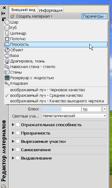 Внешний вид материала можно оценивать на объектах разной формы и разных свойств. Для выбора формы в верхней вкладке редактора материалов имеется меню «Параметры».