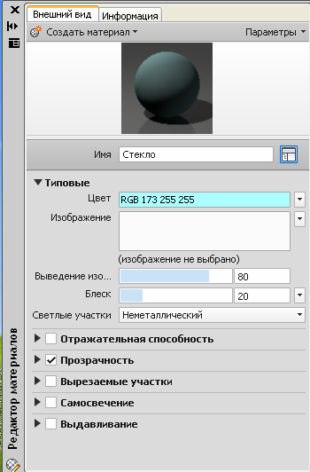 7.В поле «Имя» введите название материала:«Стекло» (вместо «По умолчанию Общий»).