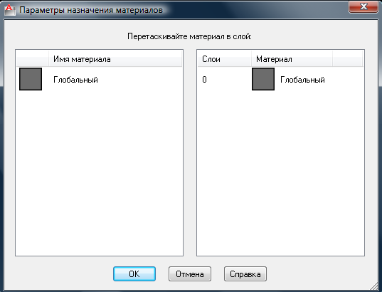 В данном окне в левой части приводиться список загруженных материалов, а в правой – список имеющихся слоёв. Необходимо в левой части выбрать материал и перетащить его в правую часть на имя соответствующего слоя. Кнопка