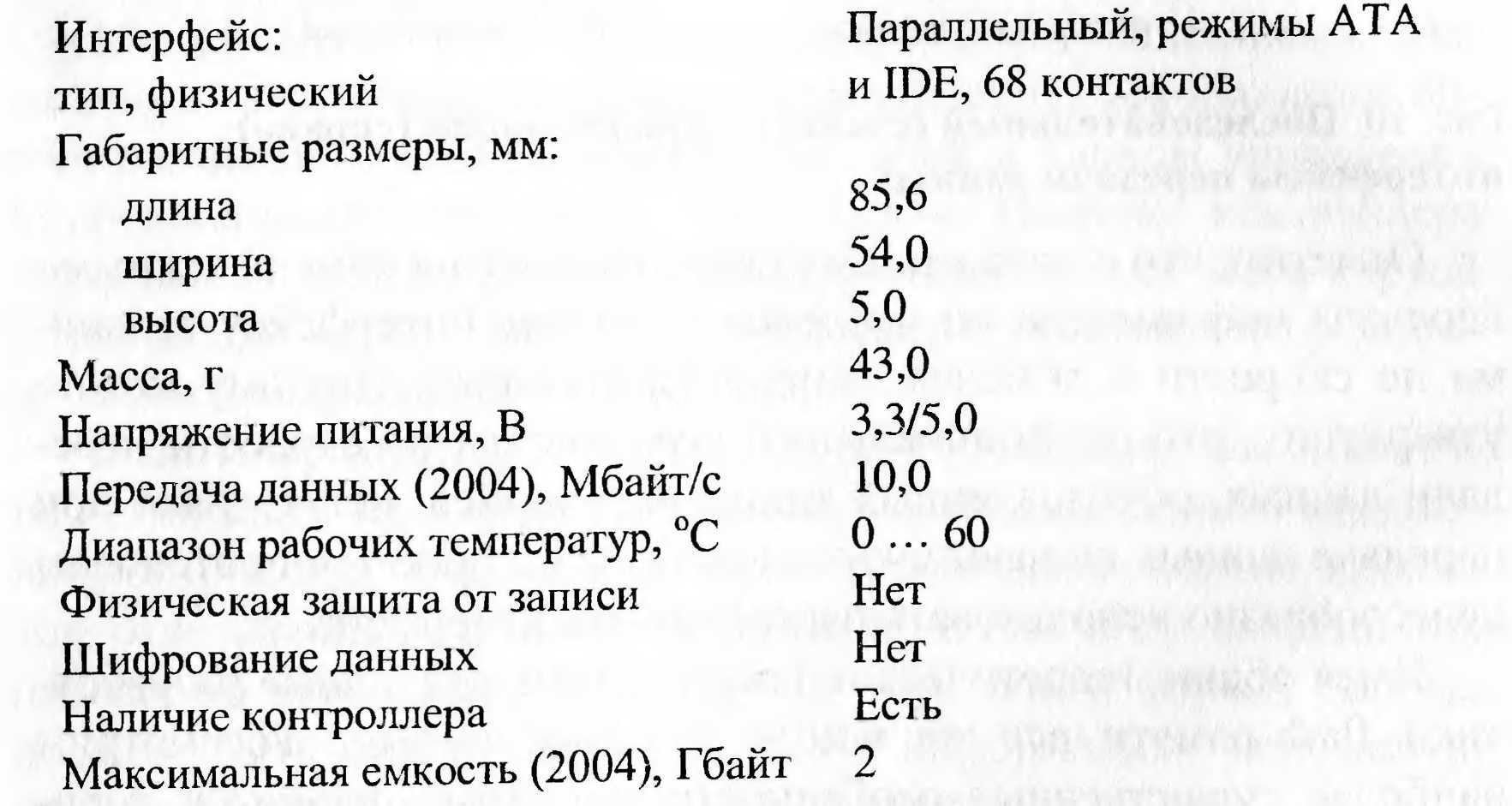 Технические характеристики носителя ATA Flash приведены ниже.