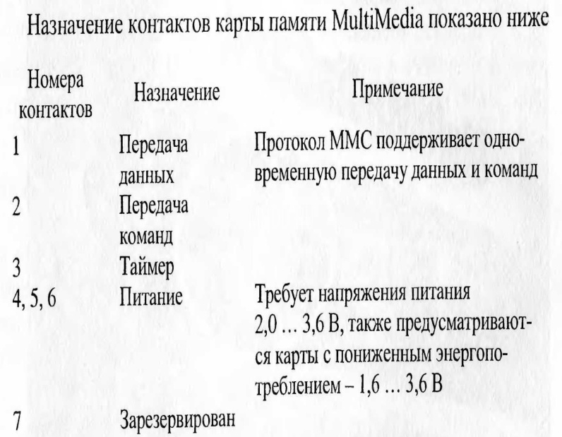 MultiMedia Card (ММС) - один из самых компактных сменных flash-накопителей (отметим, что выпускаются и ультракомпактные карты на базе ММС длиной всего 18 мм). Стандарт был разработан в 1997 г. компаниями Hitachi, SanDisk и Siemens Semiconductors, принят и поддержан более чем 35 компаниями в 1998 г. Эти компании вошли в ассоциацию MultiMedia Card Association (ММСА). Технические характеристики MultiMedia приведены ниже.