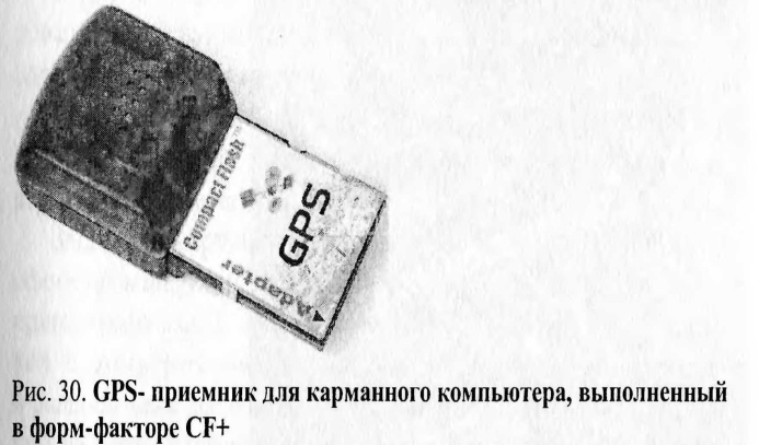 Как мы кратко заметили выше, стандарт PCMCIA используется в качестве интерфейса для подключения различных устройств к ноутбукам, одним из которых является ATA-flash. Подобным образом обстоит дело и с некоторыми другими стандартами, например CompactFlash. Сегодня в форм-факторе CompactFlash (CF+) выпускается целый ряд устройств, предназначенных в основном для карманных компьютеров: адаптеры CF-SD/MMC, приемники навигационной системы GPS, модули беспроводной связи Bluetooth, Wi-Fi и др (рис. 30). Данное техническое решение позволяет избежать дополнительных разъемов и повысить универсальность портативных устройств.