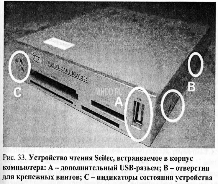Однозначно самыми распространенными являются устройства чтения с интерфейсом USB (Universal Serial Bus - универсальный последовательный интерфейс). Этим интерфейсом оборудованы как внешние, так и встраиваемые в 3,5" разъем корпуса компьютера устройства (рис. 33). Отличие заключается лишь в том, что встраиваемые устройства обычно подключаются к USB-порту непосредственно на материнской плате.