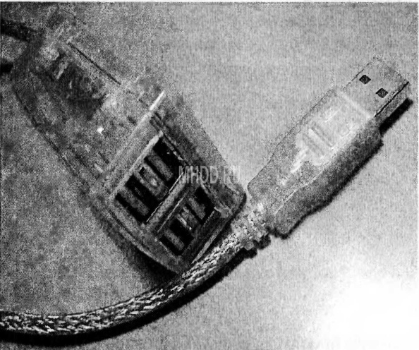Для подключения периферийных устройств (например, для чтения flash-карт) используется 4-жильный кабель типа USB-mini USB или USB-AB (рис. 34). Интерфейс USB соединяет между собой хост и устройства. Хост (иначе - «концентратор») находится внутри персонального компьютера и управляет работой внешнего устройства. Так как у неопытных пользователей часто возникает вопрос о различных спецификациях USB, подчеркнем, что спецификации USB 2.0 и USB 1.x полностью совместимы. Отличие состоит лишь в максимальной скорости передачи данных. При подключении устройства USB 2.0 к хосту USB 1.x оно будет работать на скорости младшей спецификации, т. е. скорости хоста (рис. 35, 36). Отметим, что маломощные устройства, подключаемые к шине USB (USB-flash, устройства чтения, некоторые сканеры, мыши, джойстики и др.), не требуют внешнего источника питания. Необходимое для функционирования этих устройств напряжение питания (+5 В) передается непосредственно по кабелю USB. Конкурентом USB 2.0 является стандарт FireWire (IEEE 1394), который обеспечивает скорость обмена данными, сравнимую с USB 2.0. Этот стандарт очень широко распространен (особенно в цифровых видеокамерах), однако в настоящее время у большинства настольных компьютеров базовой комплектации такой порт отсутствует. Не стоит отчаиваться, если компьютер оборудован лишь медленным хостом USB 1.x или порты USB вообще отсутствуют! В этом случае возможна установка дополнительного контроллера для шины PCI, обычно имеющего от двух до пяти портов USB (рис. 37).