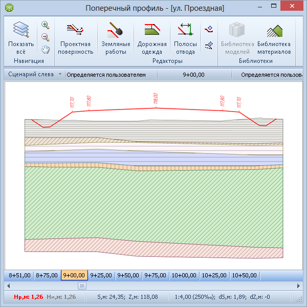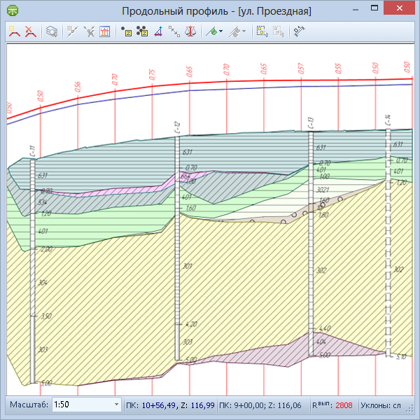 При принятии проектных решений необходимо учитывать геологическую характеристику местности. Наиболее эффективное использование геологических данных в процессе проектирования достигается при наличии объёмной геологической модели полосы изысканий. Объёмная модель позволяет построить сечение геологии по любой линии разреза. Таким образом, становится возможным оценивать положение и характеристики геологических слоёв в любой проекции: продольном профиле трассы, поперечных профилях трассы или произвольном сечении поверхности. В IndorCAD/Road основой для создания объёмной геологической модели служат данные, введённые по геологическим колонкам. На основе информации о литологическом строении скважин система строит объёмную геологическую модель, которую можно увидеть в окне 3D-вида, а также проанализировать в любом сечении.
