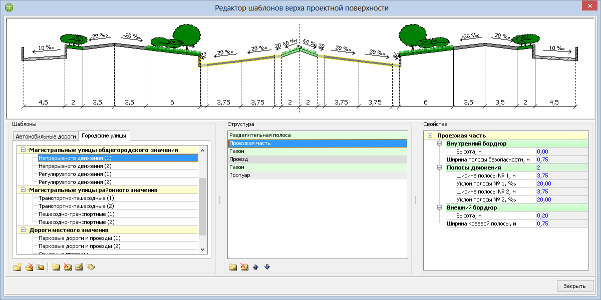 Проектирование дорог в городских условиях — на порядок более сложная задача, чем проектирование загородных объектов: необходимо учитывать плотную застройку, сложную организацию сетей коммуникаций и соблюдать при этом требования действующих норм и правил. В системе IndorCAD/Road реализованы дополнительные инструменты для решения этих задач. Основой проектирования городских улиц является набор типовых поперечных профилей, оформленный в виде альбома предустановленных шаблонов. Для проектирования новых шаблонов используется специальный редактор, позволяющий создавать шаблоны городских дорог с помощью стыковки типовых элементов. Так, например, для создания поперечного профиля магистральной улицы общегородского значения достаточно последовательно добавить элементы «Разделительная полоса», «Проезжая часть», «Газон» и «Тротуар». Каждый элемент имеет соответствующие настройки (ширина, уклон, высота бордюров и пр.), регулируя которые, можно создавать произвольные конструкции. Таким образом, набирая различные элементы в шаблон и настраивая их параметры, можно создавать поперечные профили любой сложности (с несколькими проезжими частями, коллекторными дорогами, техническими полосами и пр.).
