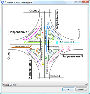 Конфигурация пункта учёта, в свою очередь, задаётся с помощью специального шаблона, который выбирается из списка доступных шаблонов при создании пункта. По умолчанию в IndorIntensity включены самые распространённые конфигурации: сечение, примыкание, четырёх-лучевое пересечение, кольцо, а также развязки типа «Труба» и «Клевер», однако этот список является расширяемым и при необходимости может быть дополнен и другими шаблонами произвольной конфигурации.