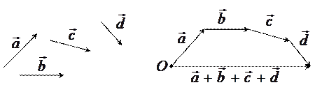 Сложение большего количества векторов осуществляется по правилу многоугольника. Заключается оно в следующем. Строится первый вектор, из его конца проводится второй вектор, из конца второго третий и так далее, затем соединяется начальная точка первого вектора с концом второго это и будет суммарным вектором.