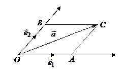 Доказательство. Совместим начальные точки базисных векторов и вектора , назовем эту точку , из конца вектора (точка ) проведем прямые, параллельные векторам до пересечения их с продолжениями векторов , точки пересечения прямых обозначим и . В результате получен параллелограмм (рисунок 5). Из правила сложения векторов следует