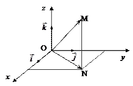 Осью координат (координатной осью) называют прямую, на которой выбрана начальная точка (начало отсчета), положительное направление и единица масштаба. Совместим начальные точки векторов ортонормированного базиса , назовем эту точку началом координат, проведем три прямые в направлении базисных векторов. Поскольку положительное направление каждой прямой и масштаб определены направлением базисного вектора и его длиной, точка отсчета совпадает с началом координат, имеем систему трех взаимно перпендикулярных осей. Ее называют прямоугольной декартовой системой координат . Базисный вектор направлен вдоль оси абсцисс , вектор - по оси ординат , вектор по оси аппликат .