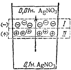Если смешиваются растворы одного и того же вещества, но с разной концентрацией, то более разбавленный раствор приобретает заряд, совпадающий по знаку с зарядом более подвижных ионов, а менее разбавленный – заряд, совпадающий по знаку с зарядом менее подвижных ионов (рис. 90).