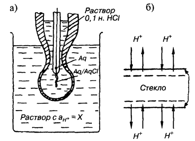 Рис. 92. Стеклянный электрод в растворе с неизвестной концентрацией ионов Н+ (а)и схема обмена ионов между двумя фазами (б)