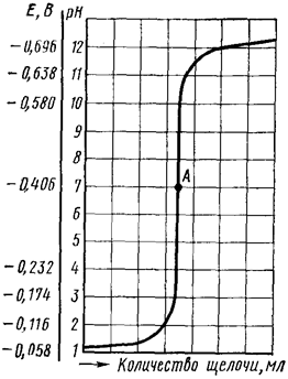 Рис. 97. Кривая потенциометрического титрования соляной кислоты гидроксидом натрия: А – точка эквивалентности