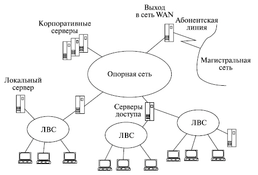 Если здания проектной организации удалены друг от друга на значительные расстояния (вплоть до их расположения в разных городах), то корпоративная сеть по своим масштабам становится территориальной сетью (WAN — Wide Area Network). В территориальной сети различают магистральные каналы передачи данных (магистральную сеть), имеющие значительную протяженность, и каналы передачи данных, связывающие ЛВС (или совокупность ЛВС отдельного здания или кампуса) с магистральной сетью и называемые абонентской линией или соединением "последней мили".