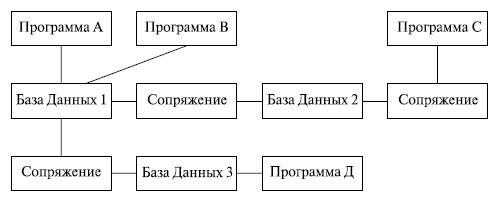 Поэтому второй способ информационного согласования программ — построение системы, в которой несколько частных баз данных сопрягаются с помощью специального программного интерфейса, как показано на рис. 10.2.