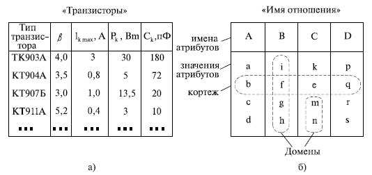 Каждый объект предметной области характеризуется своими атрибутами, каждый атрибут имеет имя и значение. Например, объект осциллограф. Имена его атрибутов — частота повторения, чувствительность, полоса пропускания; значения атрибутов — соответствующие значения параметров. Или объект транзистор, имена его атрибутов — наименования параметров, значения атрибутов — значения параметров и т. д.