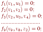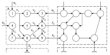Выделим в соответствии с блочно-иерархическим подходом в структуре объекта некоторые подмножества элементов и назовем их блоками (на рисунке показаны штриховыми линиями). Пусть состояние каждой связи характеризуется одной фазовой переменной vi, zj или uk. Здесь vi относится к внутренним связям между элементами данного блока, zj и uk относятся к выходам и входам блока соответственно.