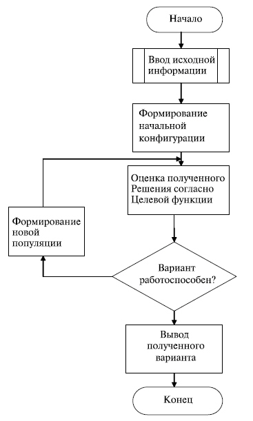 Если наилучший полученный вариант конфигурации не соответствует заданным условиям, происходит ранжирование сгенерированной популяции. На основе ранжированной популяции осуществляется формирование новой популяции, и далее процесс повторяется до получения рабочего варианта.