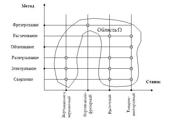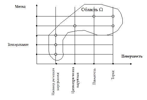 На рис. показана геометрическая интерпретация бинарного отношения “поверхность - технологические методы”, а на рис. - бинарного отношения “метод- станок”. К тернарным отношениям R(3) относится совместное использование "станок - метод - инструмент".