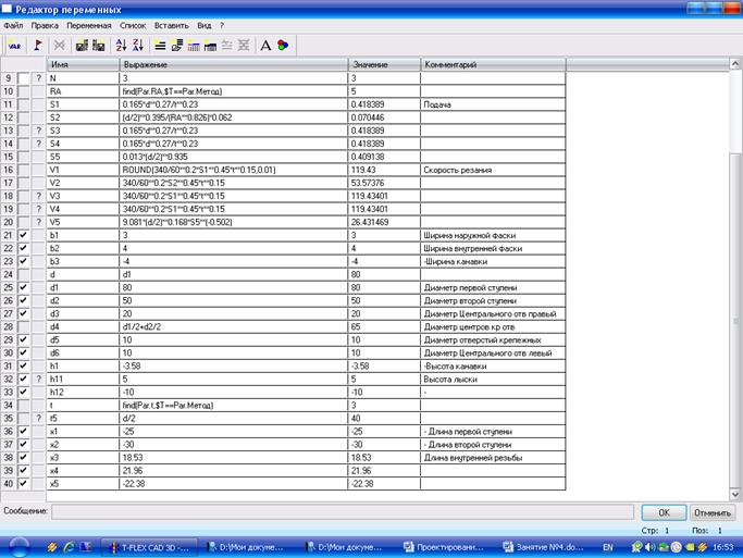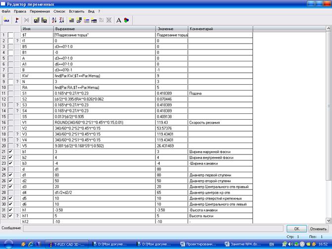 Таблица ТП строится в среде TflexCAD ниже чертежа параметризованного фланца. Каждая клетка таблицы представлена текстовой строкой и связана уровнем видимости Bi, который зависит от значения переменной перехода.