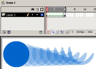 Параметры shape tweening: Easing задает обратное экспоненциальное ускорение. Величина этого параметра может изменяться от - 100 до + 100. Это означает, что если вы зададите отрицательный easing, то скорость будет увеличиваться (см. Рис. 5_3). И наоборот, если easing будет положительным, анимация будет замедляться (см. Рис. 5_4).