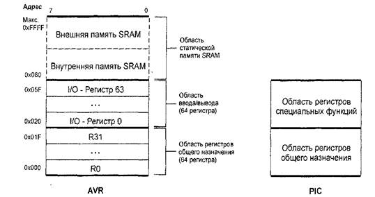 Рис. 2.1. Структура памяти данных в микроконтроллерах AVR и PIC