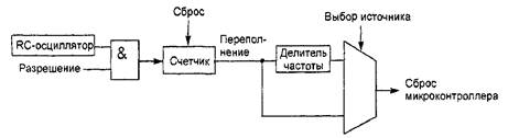 Сторожевой таймер (watchdog timer) – встроенный таймер, тактируемый внутренним RC-осциллятором, который автоматически сбрасывает микроконтроллер при переполнении своего счетного регистра. В частности, он используется для предотвращения перехода микроконтроллера в режим бесконечного цикла, когда на него невозможно повлиять извне. Обобщенная структурная схема сторожевого таймера показана на рис. 5.1.
