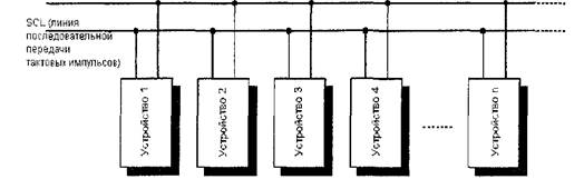 Интерфейс I2С (Inter-integrated Circuit), состоящий только из двух линий (SDA и SCL), предназначен для низкоскоростного последовательного обмена данными с периферийными устройствами, подсоединенных к одной общей шине (рис. 7.11).