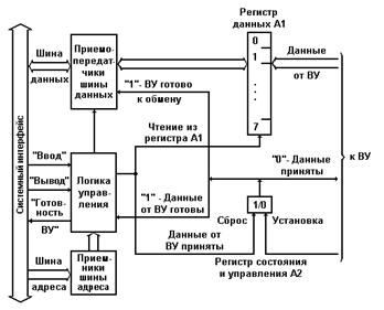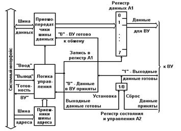 Для формирования управляющего сигнала "Выходные данные готовы" и приема из ВУ управляющего сигнала "Данные приняты" в контроллере используется одноразрядный адресуемый регистр состояния и управления А2 (обычно используются раздельные регистр состояния и регистр управления). Одновременно с записью очередного байта данных с шины данных системного интерфейса в адресуемый регистр данных контроллера (порт вывода А1) в регистр состояния и управления записывается логическая единица. Тем самым формируется управляющий сигнал "Выходные данные готовы" в шине связи с ВУ.