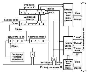 После передачи очередного байта данных в регистр состояния А2 записывается 1. Единичный выходной сигнал регистра А2 информирует процессор о готовности контроллера к приему следующего байта данных и передаче его по линии связи в ВУ. Этот же сигнал запрещает формирование импульсов со схемы выработки импульсов сдвига - делителя частоты сигналов тактового генератора на 16. Счетчик импульсов сдвига (счетчик по mod 10) находится в нулевом состоянии и его единичный выходной сигнал поступает на вентиль И, подготавливая цепь выработки сигнала загрузки сдвигового регистра.
