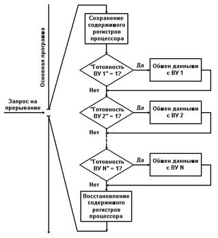 После сохранения содержимого регистров процессора, используемых в подпрограмме, начинается последовательный опрос регистров состояния контроллеров всех ВУ, работающих в режиме прерывания. Как только подпрограмма обнаружит готовое к обмену ВУ, сразу выполняются действия по его обслуживанию. Завершается подпрограмма обработки прерывания после опроса готовности всех ВУ и восстановления содержимого регистров процессора.