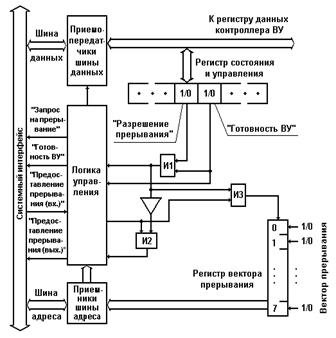 Формирование сигналов прерываний - запросов ВУ на обслуживание происходит в контроллерах соответствующих ВУ. В простейших случаях в качестве сигнала прерывания может использоваться сигнал "Готовность ВУ", поступающий из контроллера ВУ в системный интерфейс микроЭВМ. Однако такое простое решение обладает существенным недостатком - процессор не имеет возможности управлять прерываниями, т. е. разрешать или запрещать их для отдельных ВУ. В результате организация обмена данными в режиме прерывания с несколькими ВУ существенно усложняется.