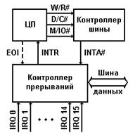 Упрощенная схема взаимодействия контроллера прерываний с процессором и контроллером шины имеет следующий вид.