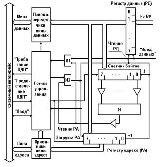 Перед началом очередного сеанса ввода данных из ВУ процессор загружает в регистры его контроллера следующую информацию: в счетчик байт - количество принимаемых байт данных, а в регистр адреса - начальный адрес области памяти для вводимых данных. Тем самым контроллер подготавливается к выполнению операции ввода данных из ВУ в память микроЭВМ в режиме ПДП. Байты данных из ВУ поступают в регистр данных контроллера в постоянном темпе. При этом каждый байт сопровождается управляющим сигналом из ВУ "Ввод данных", который обеспечивает запись байта данных в регистр данных контроллера. По этому же сигналу и при ненулевом состоянии счетчика байт контроллер формирует сигнал ТПДП. По ответному сигналу процессора ППДП контроллер выставляет на шины адреса и данных системного интерфейса содержимое своих регистров адреса и данных соответственно. Формируя управляющий сигнал "Вывод", контроллер ПДП обеспечивает запись байта данных из своего регистра данных в память микроЭВМ. Сигнал ППДП используется в контроллере и для модификации счетчика байт и регистра адреса. По каждому сигналу ППДП из содержимого счетчика байт вычитается единица, и как только содержимое счетчика станет равно нулю, контроллер прекратит формирование сигналов "Требование прямого доступа к памяти".