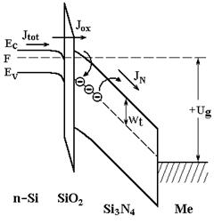 Ток в окисле Jox - туннельный ток инжекции, ток JN - ток сквозной проводимости в нитриде. В случае прямого туннелирования электронов в зону проводимости SiO2 сквозь треугольный барьер плотность тока определяется уравнением Фаулера-Нордгейма