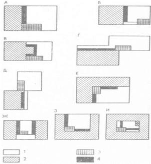 Различные варианты расположения обеих зон в здании схематически показаны на рисунке 2, из которого видно, что в зданиях с прямоугольной формой плана наиболее благоприятные условия для объектов общественного питания создаются при Г- и П-образном расположении зон для посетителей. Для вытянутых в плане зданий с ограниченной глубиной следует применять только продольную схему (схемы Б, В и Ж). Недостаток схемы состоит в том, что два помещения зоны для посетителей непосредственно не связаны между собой.